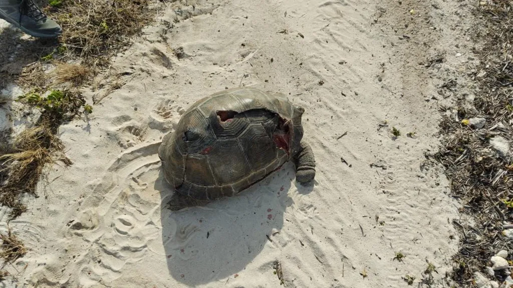 Campaigners say this tortoise’s shell was smashed by contruction machinery